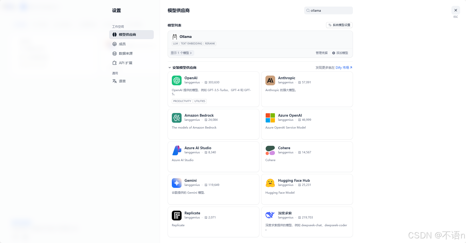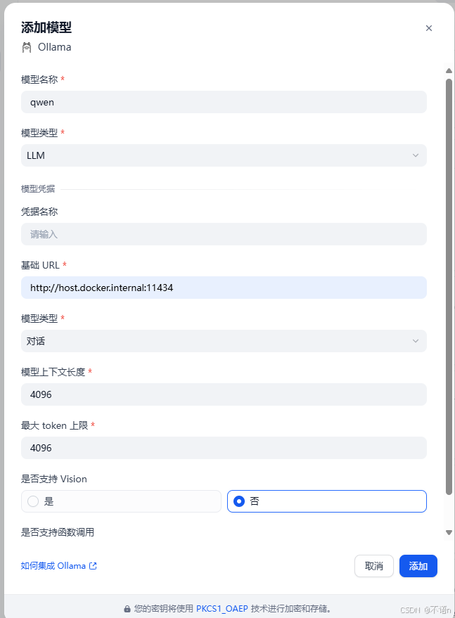 在 Dify 设置 → 「模型提供商」中添加 Ollama 连接: