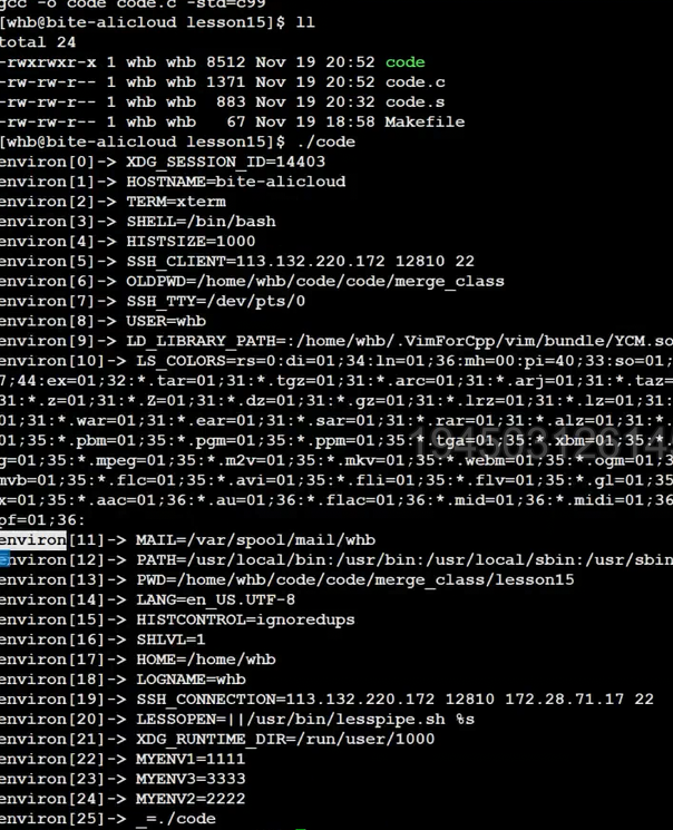 {const char* str = "helloworld";printf("code addr: %p\n", main);printf("init global addr: %p\n", &g_val);printf("uninit global addr: %p\n", &g_unval);static int test = 10;char* heap_mem = (char*)malloc(10);char* heap_mem1 = (char*)malloc(10);char* heap_mem2 = (char*)malloc(10);char* heap_mem3 = (char*)malloc(10);printf("heap addr: %p\n", heap_mem); //heap_mem(0), &heap_mem(1)printf("heap addr: %p\n", heap_mem1); //heap_mem(0), &heap_mem(1)printf("heap addr: %p\n", heap_mem2); //heap_mem(0), &heap_mem(1)printf("heap addr: %p\n", heap_mem3); //heap_mem(0), &heap_mem(1)printf("test static addr: %p\n", &test); //heap_mem(0), &heap_mem(1)printf("stack addr: %p\n", &heap_mem); //heap_mem(0), &heap_mem(1)printf("stack addr: %p\n", &heap_mem1); //heap_mem(0), &heap_mem(1)printf("stack addr: %p\n", &heap_mem2); //heap_mem(0), &heap_mem(1)printf("stack addr: %p\n", &heap_mem3); //heap_mem(0), &heap_mem(1)printf("read only string addr: %p\n", str);for (int i = 0; i < argc; i++){printf("argv[%d]: %p\n", i, argv[i]);}for (int i = 0; env[i]; i++){printf("env[%d]: %p\n", i, env[i]);}return 0;