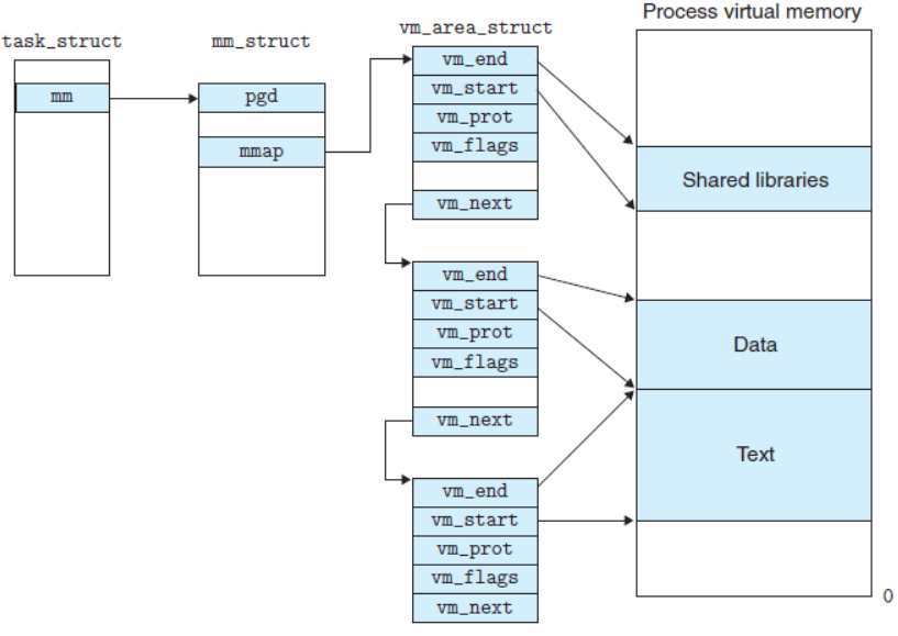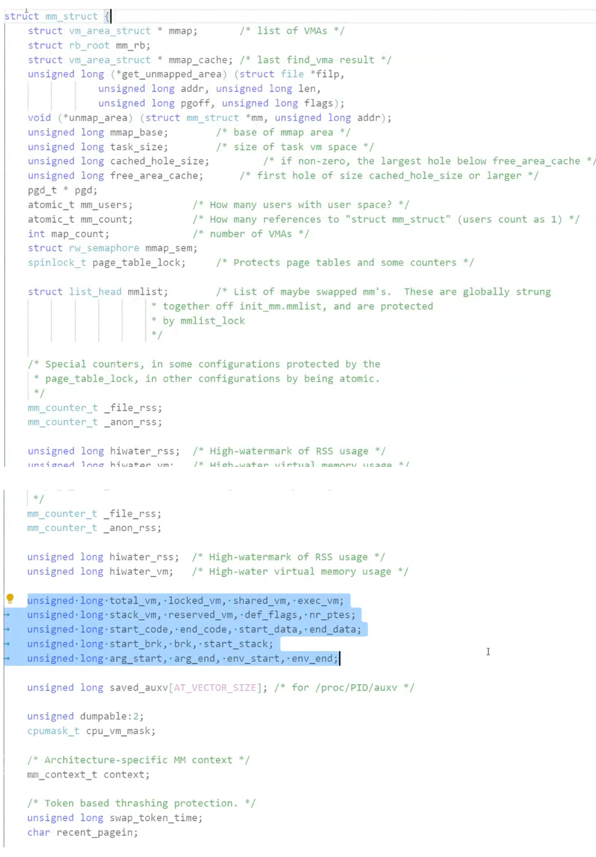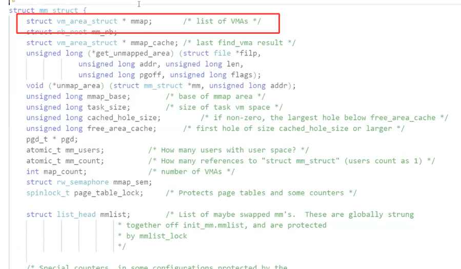 {/*...*/struct vm_area_struct* mmap; /* 指向虚拟区间(VMA)链表 */struct rb_root mm_rb; /* red_black树 */unsigned long task_size; /*具有该结构体的进程的虚拟地址空间的大小*//*...*/// 代码段、数据段、堆栈段、参数段及环境段的起始和结束地址。unsigned long start_code, end_code, start_data, end_data;unsigned long start_brk, brk, start_stack;unsigned long arg_start, arg_end, env_start, env_end;/*...*/