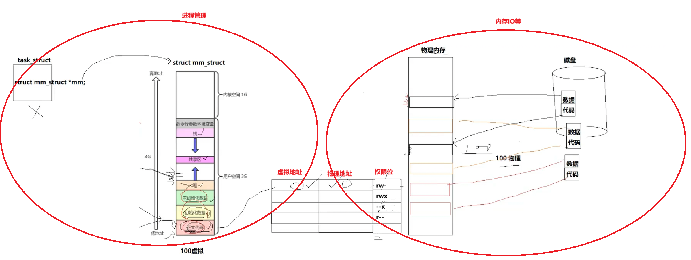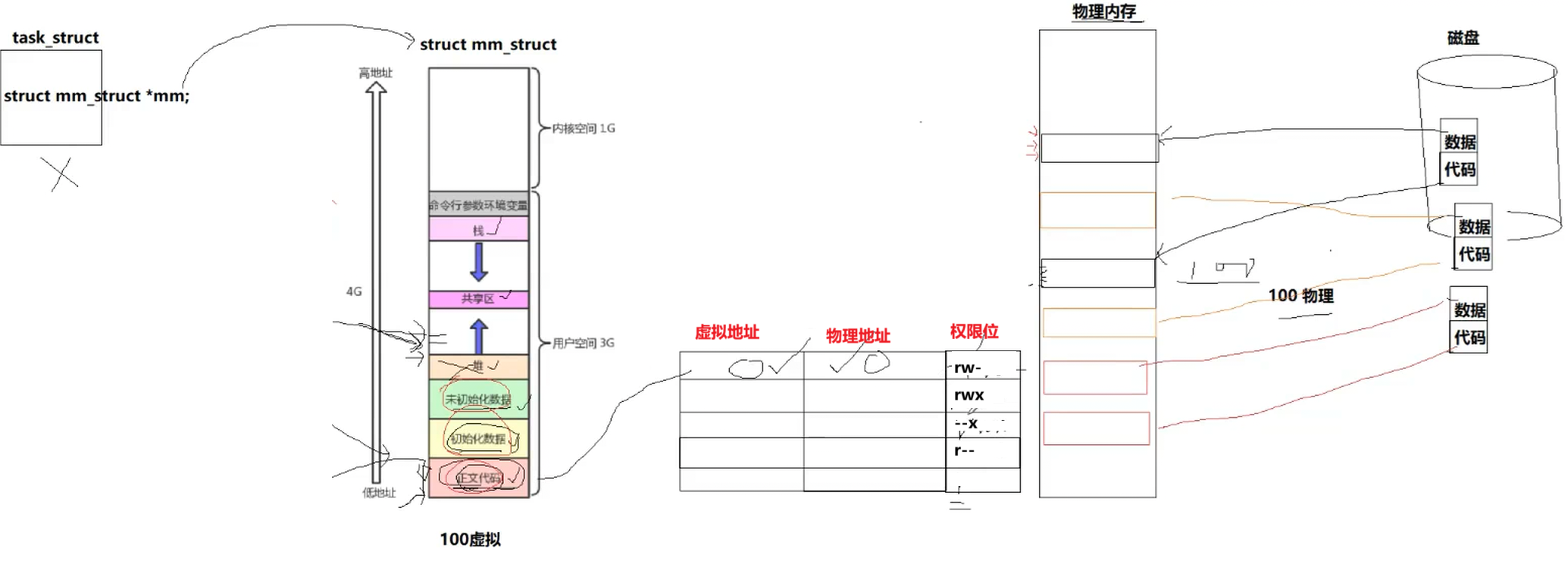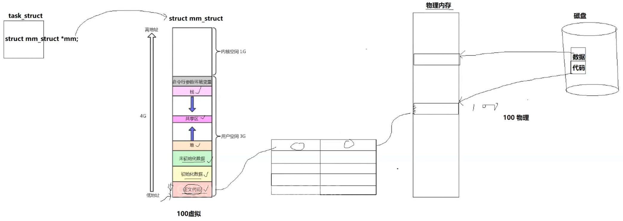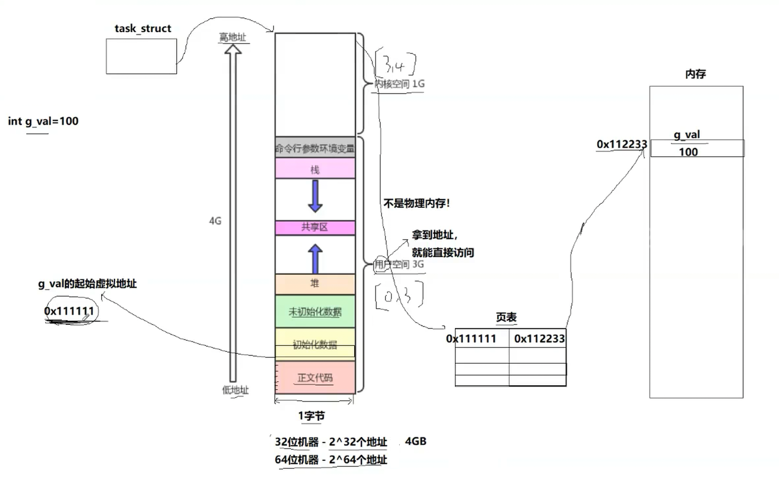 系统中一个进程对应一个虚拟地址空间,虚拟地址空间宽度是1字节,所以32位下总共就是4G,0~3G是用户空间,用户拿着地址就可以直接访问,3~4G是内核空间,虚拟地址空间不是物理内存,我们的task_struct执行代码就会在虚拟地址空间上找到对应的扁变量的虚拟地址,有了虚拟地址就可以经过页表(一个进程就对应一个页表,页表是用来做虚拟地址到物理地址映射的),找到变量实际存储的物理地址,所有对象都有虚拟地址,我们都可以通过这个方法找到对应物理地址