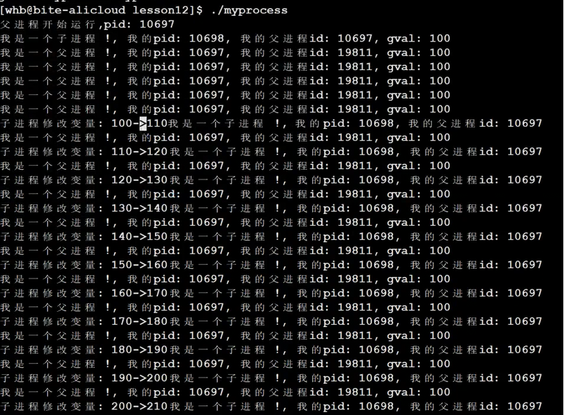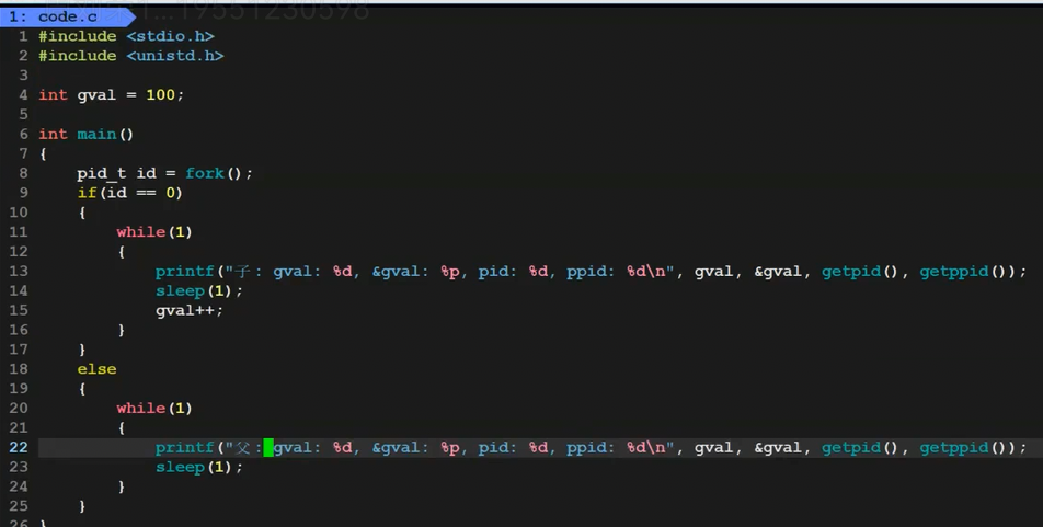我们发现,父子进程,输出地址是一致的,但是变量内容不一样。所以父子进程输出的变量绝对不是同一个变量,变量内容不一样, 但地址值是一样的,说明,该地址绝对不是物理地址