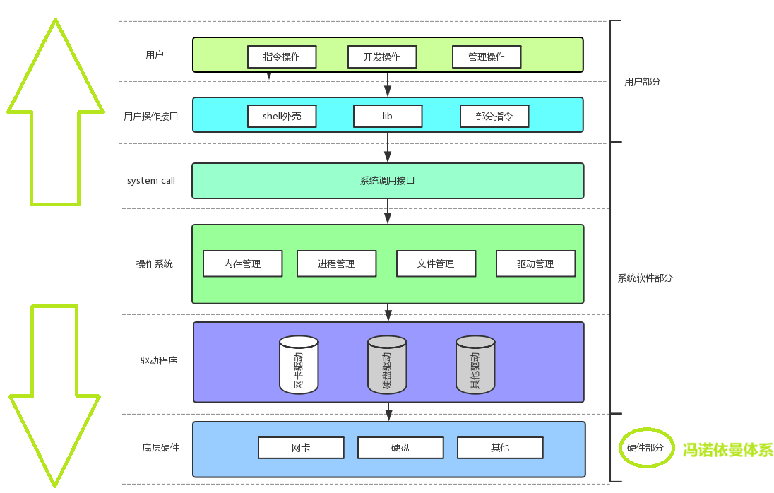 上图描述的是软硬件体系层状结构,体系结构设计成层状满足低内聚、高耦合特点,这样当我们修改某一层的具体实现,其他层并不需要发生改动,大大降低我们的维护成本。