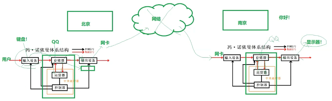 以QQ聊天为例,我们来分析根据冯诺依曼体系来分析一下数据的流动过程。
