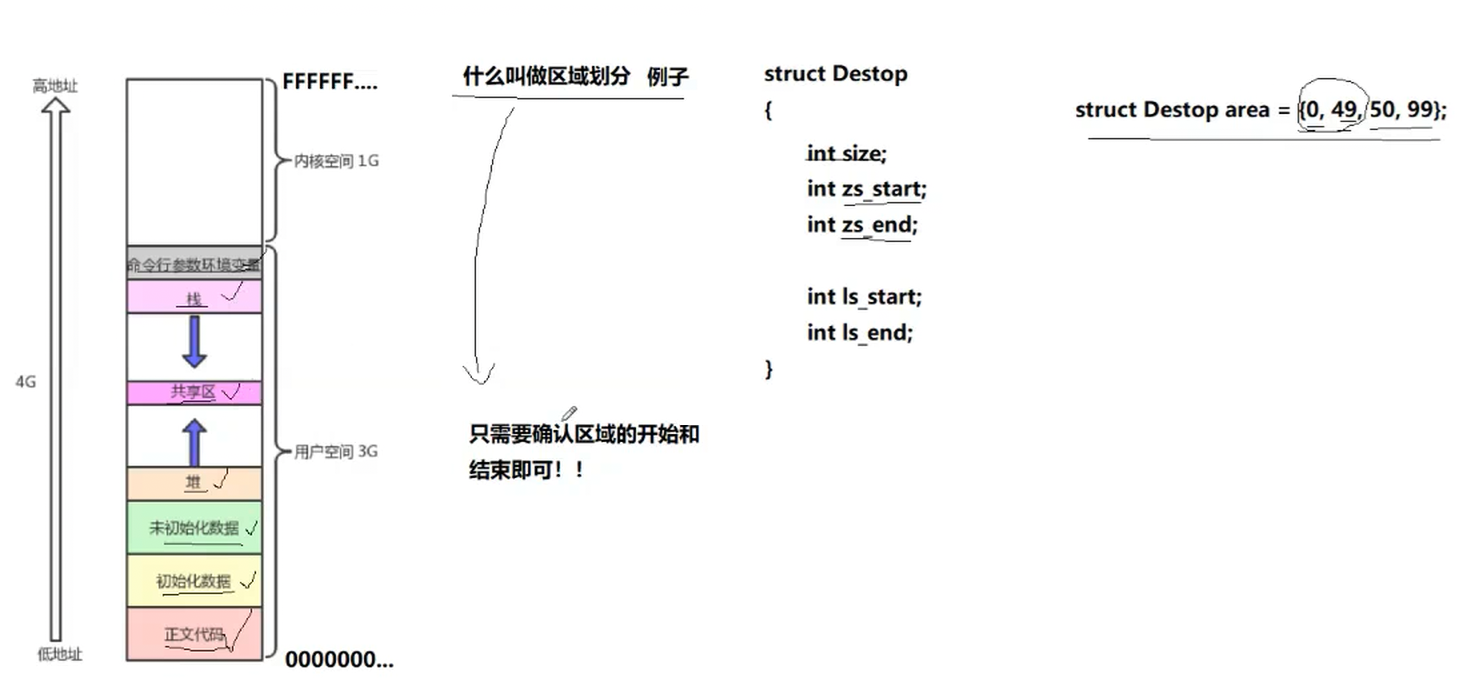 我们以一张桌子为例,我们划分所谓的区域其实只要在桌子上一条线,那么我们就可以说从哪到哪是什么什么区域,我们发现通过描述从什么到什么就可以划分一个区域,对应到计算机上,一块连续的区域,我们只需要记录开始和结束地方的地址我们就可以划分一块区域出来,我们也就可以通过int类型来表示这些地址了。4GB空间,我们对其进行编址,0、1、2、……等这一个一个刻度就是一个一个地址,即虚拟地址空间上的地址。同样的我们调整某一块区域大小也只需要调整对应的开始和结束的地方地址,比如上移或者下移。