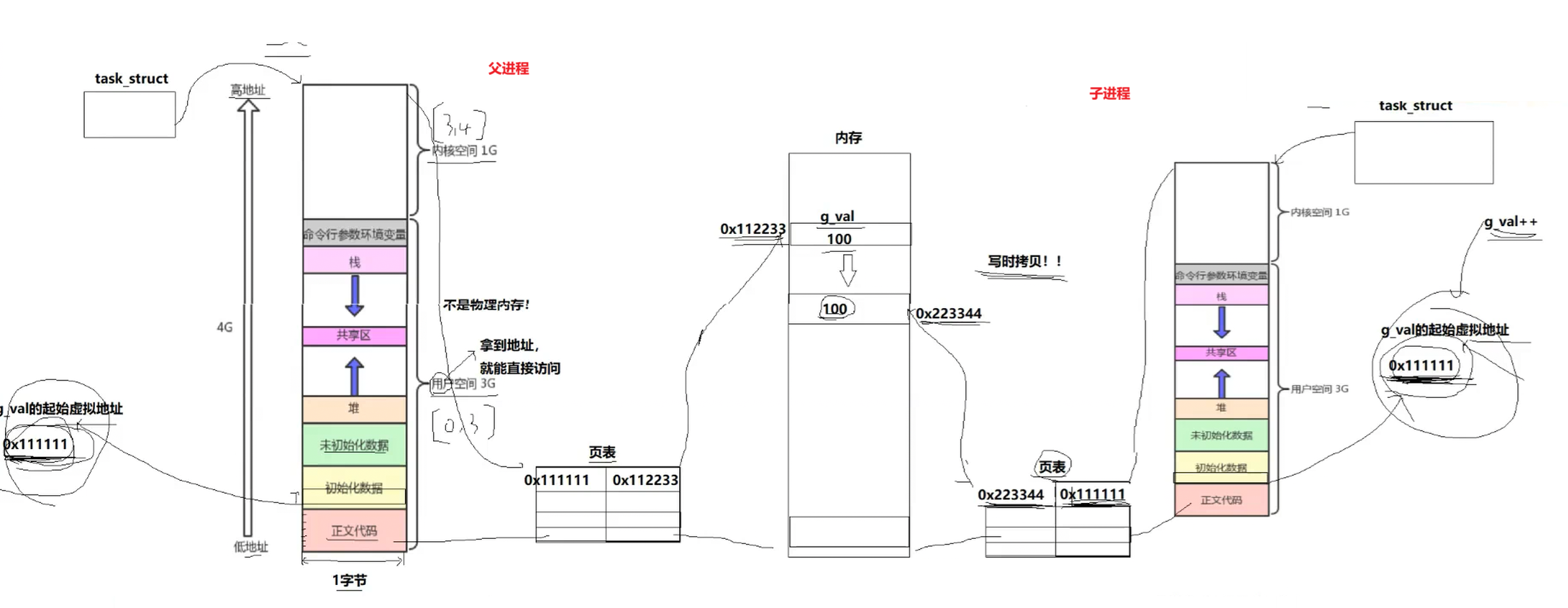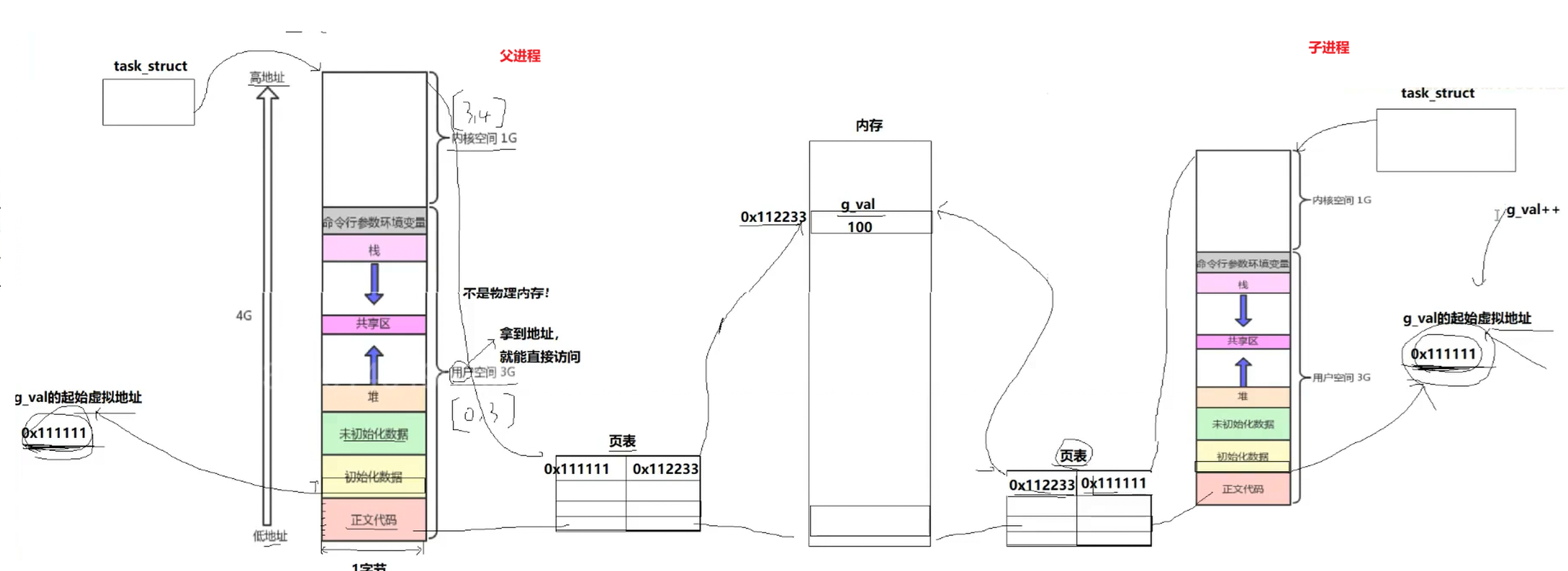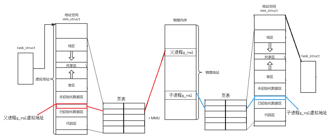 所以当fork出子进程,子进程也要有自己的虚拟地址空间和页表,这里就发生了浅拷贝,虚拟与物理地址与父进程完全一样。