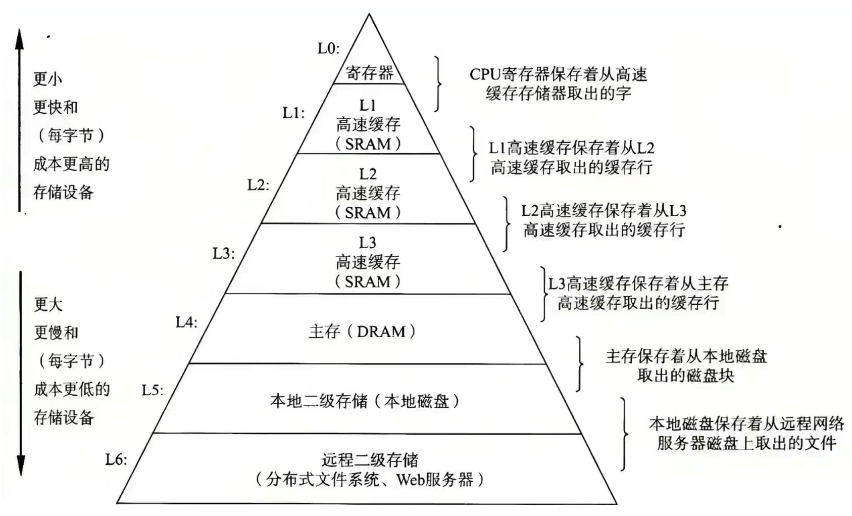 根据上面的图,我们发现速度越快、越贵、存储空间越少,其中CPU的速度是最快的,而往下的存储跟CPU的速度最少相差好几个数量级以上,所以如果没有内存,那么CPU直接跟外设打交道,那么根据木桶效应,最终组装出来的系统的速度就会直接由外设决定(每次CPU都需要等外设拷贝数据,外设相比CPU又太慢了),效率非常低效。而使用内存,我们就可以设计上图中的三级缓存机制,以及其他算法,将整体系统效率提升到相对客观的程度(内存跟CPU之间相差只有几个数量级,并且CPU从内存拷贝数据时,我们可以通过提前将下一次可能需要的数据准备好这样的设计)。当然观察上面的图,我们发现其实我们也可以将所有的设备都是用寄存器制作,速度也非常快,但是造价非常高昂。