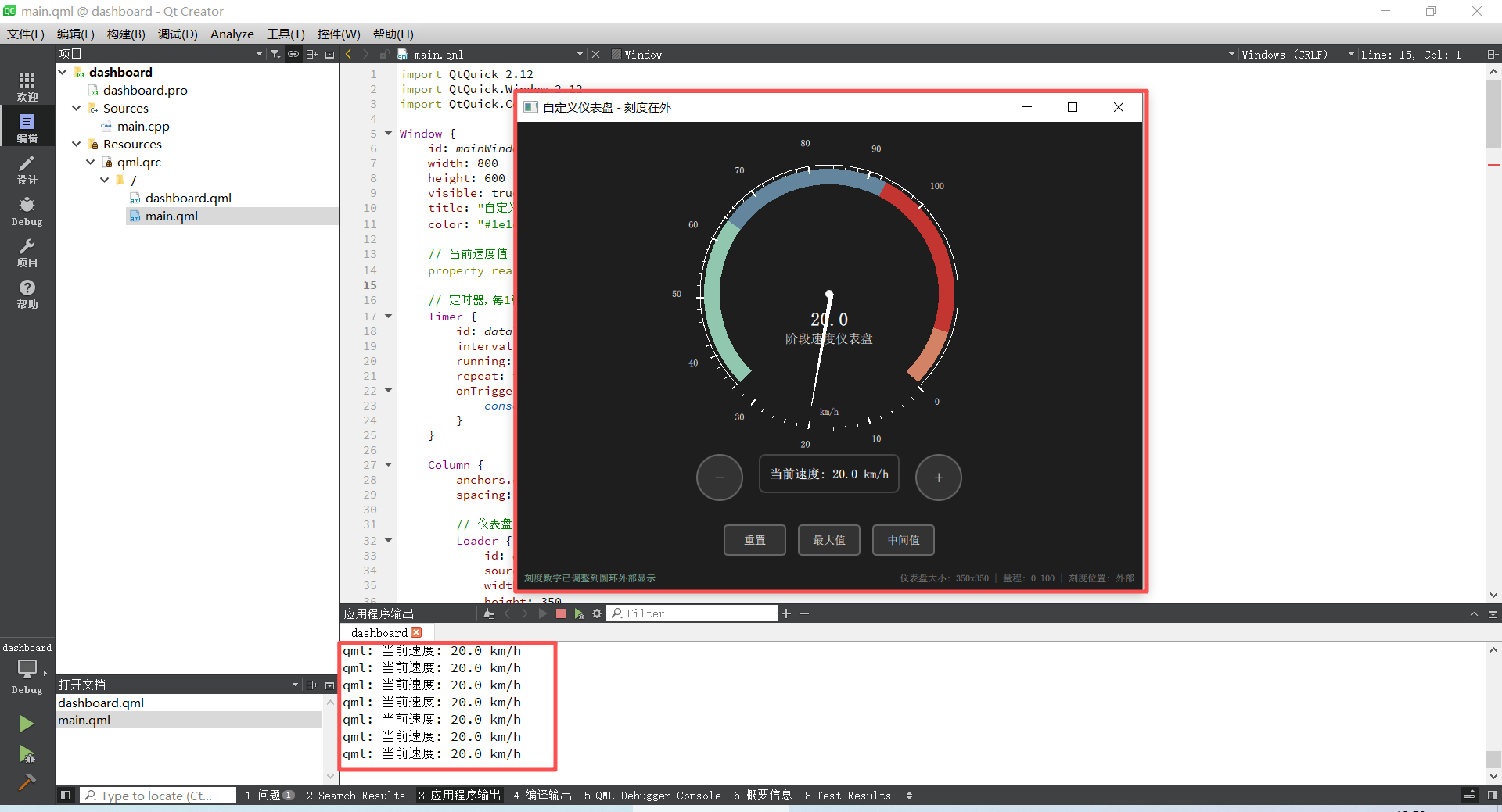 import QtQuick.Controls 2.12Window {id: mainWindowwidth: 800height: 600visible: truetitle: "自定义仪表盘 - 刻度在外"color: "#1e1e1e"// 当前速度值property real currentSpeed: 0// 定时器,每1秒更新数据Timer {id: dataTimerinterval: 1000running: truerepeat: trueonTriggered: {console.log("当前速度:", currentSpeed.toFixed(1) + " km/h")}}Column {anchors.centerIn: parentspacing: 30// 仪表盘 - 使用加载器动态加载Loader {id: dashboardLoadersource: "dashboard.qml"width: 350 // 稍微加大以容纳外部刻度height: 350onLoaded: {item.value = currentSpeeditem.minValue = 0item.maxValue = 100item.title = "阶段速度仪表盘"// 可以自定义阶段颜色item.segments = [{from: 0, to: 30, color: "#91c7ae"},{from: 30, to: 60, color: "#63869e"},{from: 60, to: 90, color: "#c23531"},{from: 90, to: 100, color: "#d48265"}]}}// 控制按钮区域Row {anchors.horizontalCenter: parent.horizontalCenterspacing: 20// 减速按钮Button {text: "-"font.pixelSize: 24width: 60height: 60background: Rectangle {color: parent.down ? "#555555" : "#333333"radius: 30border.color: "#666666"border.width: 2}contentItem: Text {text: parent.textfont: parent.fontcolor: "white"horizontalAlignment: Text.AlignHCenterverticalAlignment: Text.AlignVCenter}onClicked: {currentSpeed = Math.max(0, currentSpeed - 10)if (dashboardLoader.item) {dashboardLoader.item.value = currentSpeed}}}// 当前速度显示Rectangle {width: 180height: 50color: "transparent"border.color: "#444444"border.width: 2radius: 8Text {anchors.centerIn: parenttext: "当前速度: " + currentSpeed.toFixed(1) + " km/h"color: "white"font.pixelSize: 16font.bold: true}}// 加速按钮Button {text: "+"font.pixelSize: 24width: 60height: 60background: Rectangle {color: parent.down ? "#555555" : "#333333"radius: 30border.color: "#666666"border.width: 2}contentItem: Text {text: parent.textfont: parent.fontcolor: "white"horizontalAlignment: Text.AlignHCenterverticalAlignment: Text.AlignVCenter}onClicked: {currentSpeed = Math.min(100, currentSpeed + 10)if (dashboardLoader.item) {dashboardLoader.item.value = currentSpeed}}}}// 控制面板Row {anchors.horizontalCenter: parent.horizontalCenterspacing: 15// 重置按钮Button {text: "重置"width: 80height: 40background: Rectangle {color: parent.down ? "#555555" : "#333333"radius: 5border.color: "#666666"border.width: 2}contentItem: Text {text: parent.textfont.pixelSize: 14color: "white"horizontalAlignment: Text.AlignHCenterverticalAlignment: Text.AlignVCenter}onClicked: {currentSpeed = 0if (dashboardLoader.item) {dashboardLoader.item.value = currentSpeed}}}// 设置最大值按钮Button {text: "最大值"width: 80height: 40background: Rectangle {color: parent.down ? "#555555" : "#333333"radius: 5border.color: "#666666"border.width: 2}contentItem: Text {text: parent.textfont.pixelSize: 14color: "white"horizontalAlignment: Text.AlignHCenterverticalAlignment: Text.AlignVCenter}onClicked: {currentSpeed = 100if (dashboardLoader.item) {dashboardLoader.item.value = currentSpeed}}}// 中间值按钮Button {text: "中间值"width: 80height: 40background: Rectangle {color: parent.down ? "#555555" : "#333333"radius: 5border.color: "#666666"border.width: 2}contentItem: Text {text: parent.textfont.pixelSize: 14color: "white"horizontalAlignment: Text.AlignHCenterverticalAlignment: Text.AlignVCenter}onClicked: {currentSpeed = 50if (dashboardLoader.item) {dashboardLoader.item.value = currentSpeed}}}}}// 状态显示Text {anchors {bottom: parent.bottomright: parent.rightmargins: 10}text: "仪表盘大小: " + dashboardLoader.width + "x" + dashboardLoader.height +" | 量程: 0-100 | 刻度位置: 外部"color: "#888888"font.pixelSize: 12}// 说明文本Text {anchors {bottom: parent.bottomleft: parent.leftmargins: 10}text: "刻度外部显示"color: "#91c7ae"font.pixelSize: 12}