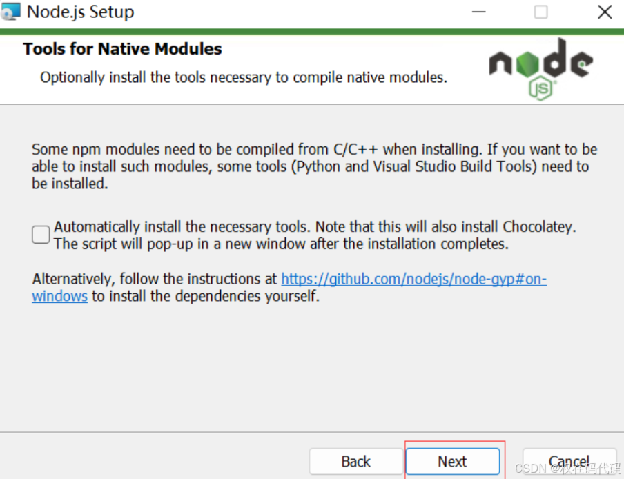 2、安装Node.js依赖,推荐直接默认路径安装。node.js官网中直接下载适配自己电脑的版本即可。中间注意这一步不用勾选(勾选了之后会把所有的不管之前安装过的还是没安装的工具全部下载一遍,可能会导致路径出问题)