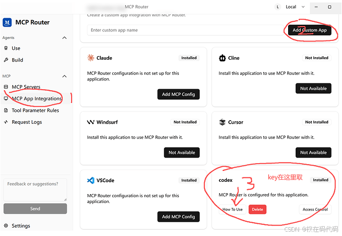 5、添加 MCP App,因为 MCP Router 没有集成 codex,需要添加自定义应用并使用它的 token。