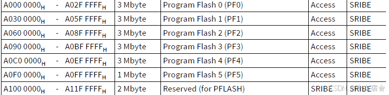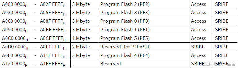 针对TC397这个芯片,不启用SOTA功能时,App程序可以存在如下所示的PF0(Program Flash0)~ PF5(Program Flash5)中,空间大小共计16Mbyte。这个也是在标准模式下的地址映射。