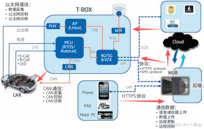 我们可以把上图的后端理解成云平台,我们可以通过手机,平板或者PC登录后端然后通过无线来与T-BOX或者具有无线通信功能的网关主控进行通信,来传递升级包,升级包如果应用到T-BOX则直接进行SOTA即可,如果是需要升级车辆系统里的ECU,则通过UDSon CAN或者UDSon ETH亦或者另外的私有协议完成SOTA/FOTA。