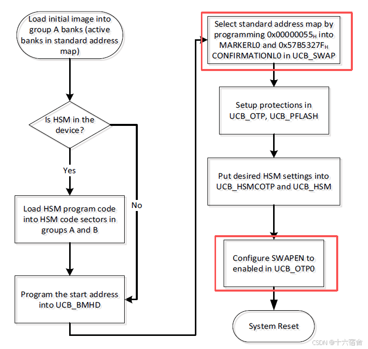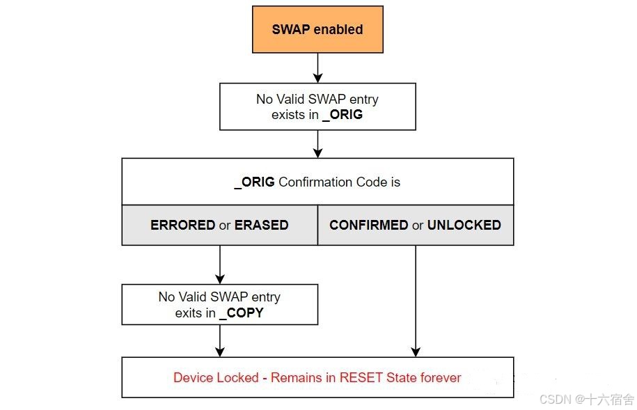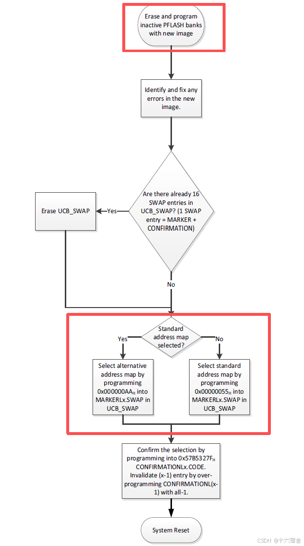 系统运行时直接修改UCB23/UCB31来切换标准或者Alternate模式,因为由于UCB刷写次数的限制(100次),我们可以通过16个SWAP配置依次使用来增加SWAP的次数(100*16=1600次)。下图的流程就是充分利用了最后一个有效条目生效,来增加SWAP的次数的一种系统运行时SWAP配置流程。