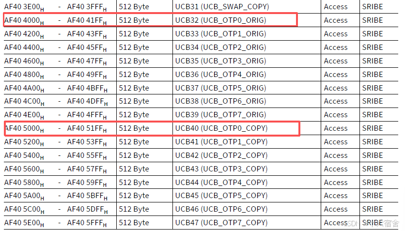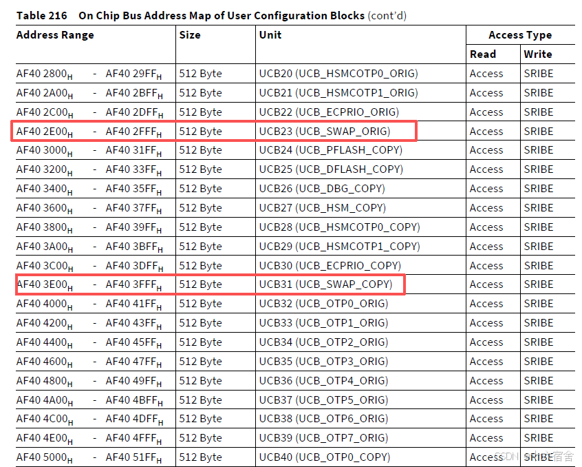 所有的UCB(User Configuration Block)存储在0xAF40 0000-0xAF40 5FFF地址范围内,UCB23和UCB31作为SWAP功能的ORIG和COPY的UCB必须在使能SWAP功能之前完成正确的配置,下图为UCB23/31的地址位置。
