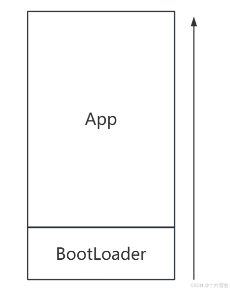如下图所示,ECU的Flash布局仅仅包含BootLoader(启动引导程序)和应用程序两个部分,该类型ECU需要更新时,首先将ECU从当前运行的应用程序分区切换至BootLoader运行(一般为重启默认从BootLoader开始,BootLoader判断有升级需求),在BootLoader中将应用分区当前版本数据擦除后,再从升级主控接收新版本程序并写入应用程序分区,数据检验无误后重启ECU切换至应用分区(BootLoader检测到有正常可运行的APP)即可运行新版本软件。