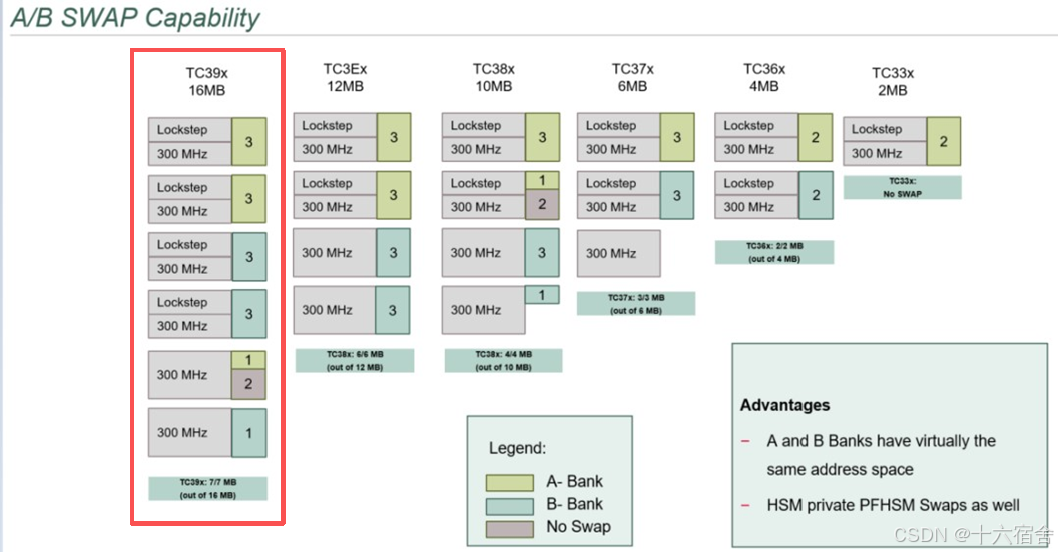 如果要使用SWAP功能,首先,芯片的Flash资源对于我们的程序大小是足够的。因为SWAP功能需要两个等大小的物理Flash空间,用以存储程序。例如APP程序的大小为4 Mbyte,如果要使用SWAP功能,至少需要硬件的Flash空间>=8Mbyte。下图显示了针对不同芯片的AB SWAP功能对应的A/B Bank划分,图中红框为TC39x的A/B划分,由上到下为PF0-PF5。