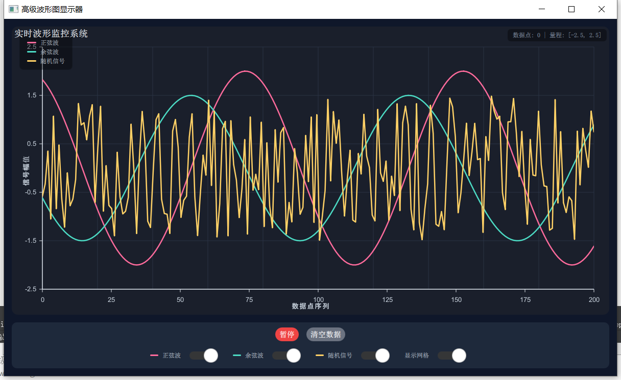 function updateWaveformData() {time += 0.08// 正弦波数据var sineValue = Math.sin(time) * 2.0waveformChart.addDataPoint(0, sineValue)// 余弦波数据 var cosineValue = Math.cos(time) * 1.5waveformChart.addDataPoint(1, cosineValue)// 随机信号数据var randomValue = (Math.random() - 0.5) * 3waveformChart.addDataPoint(2, randomValue)