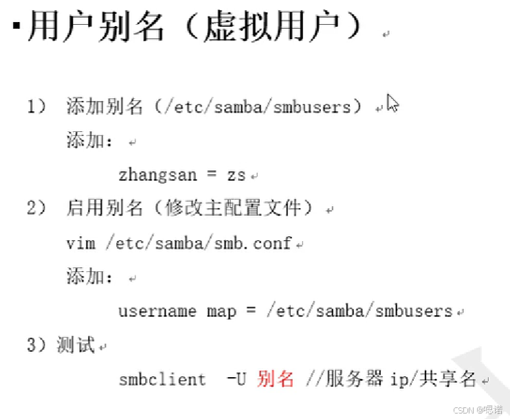 - 客户端用 ** 不存在于系统的 “虚拟用户名”** 登录,但 Samba 会把它 “映射” 到一个真实系统用户(比如虚拟用户