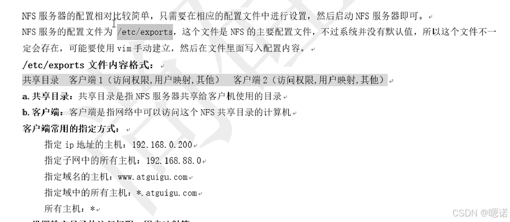 是 NFS 共享规则的配置文件,格式为共享目录 客户端范围(权限)