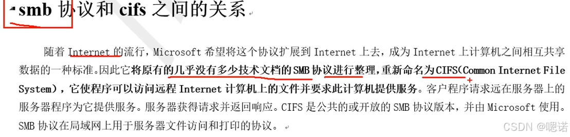 - CIFS 是 SMB 的延伸:CIFS 继承了 SMB 的基本功能,如文件和打印机共享、用户认证、权限管理等。同时,CIFS 针对互联网环境的特点,在协议的结构、数据传输方式等方面进行了优化,以便更高效地在不同操作系统和网络环境中使用。