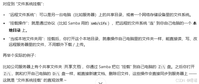 协议,也是跨平台的,Windows、Linux 这些系统之间都能互通。 - 厉害的是,能把服务器的文件系统 “挂载” 到自己电脑上,就跟用本地文件夹一样方便。