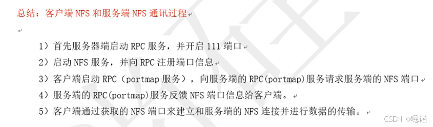 - 客户端想要访问某个 NFS 服务时,先向服务器的 RPC 服务(111 端口)查询该 NFS 服务对应的端口号,然后再向这个端口发送请求。这样,即使 NFS 服务的端口发生变化,客户端也能通过 RPC 服务获取到正确的端口信息,保证通信的正常进行。