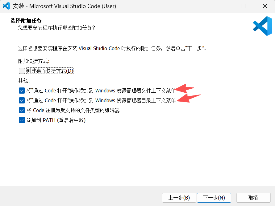 我们只需要找到当时下载的vscode.exe文件,重新安装一遍,把这两个选项勾选上即可,安装好后我们原先的环境和安装好的插件都会保持不变。