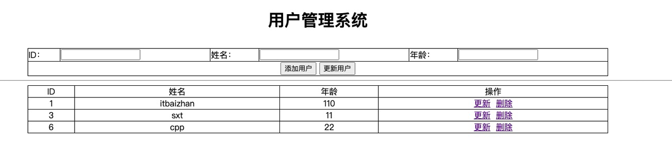var userId = $("#userId").val();var name = $("#name").val();var age = $("#age").val();var data = {id : userId,name:name,age:age,flag:"updateUser"}// 发送请求