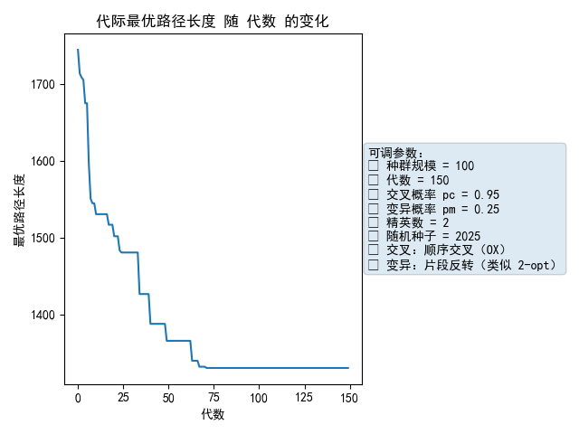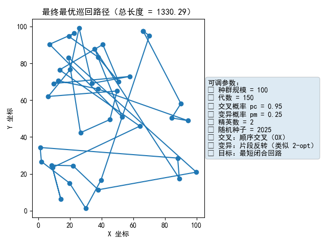 df_route["X坐标"]=df_route["城市编号"].map(df_coords["X坐标"]); df_route["Y坐标"]=df_route["城市编号"].map(df_coords["Y坐标"])def add_param_box(ax, params, extra=""):txt=("可调参数:\n"f"• 种群规模 = {params['pop_size']}\n"f"• 代数 = {params['generations']}\n"f"• 交叉概率 pc = {params['pc']}\n"f"• 变异概率 pm = {params['pm']}\n"f"• 精英数 = {params['elite_k']}\n"f"• 随机种子 = {params['seed']}\n""• 交叉:顺序交叉(OX)\n""• 变异:片段反转(类似 2-opt)")if extra: txt+="\n"+extraax.text(1.02,0.5,txt,transform=ax.transAxes,va="center",ha="left",fontsize=10,bbox=dict(boxstyle="round",alpha=0.15))# 图1 最终路线