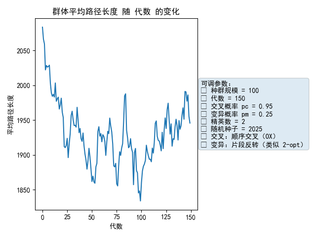 Chromosome = List[int]def euclid(a: City, b: City) -> float:return math.hypot(a[0]-b[0], a[1]-b[1])def tour_length(route: Chromosome, coords: List[City]) -> float:return sum(euclid(coords[route[i]], coords[route[(i+1)%len(route)]]) for i in range(len(route)))def init_population(pop_size: int, n_cities: int, seed: int) -> List[Chromosome]:random.seed(seed); base=list(range(n_cities)); pop=[]for _ in range(pop_size):c=base[:]; random.shuffle(c); pop.append(c)return popdef fitness(route, coords): return 1.0/(tour_length(route, coords)+1e-9)def roulette(pop, coords):fit=[fitness(ind, coords) for ind in pop]; s=sum(fit); r=random.random()*s; a=0for ind,f in zip(pop,fit):a+=fif a>=r: return ind[:]return pop[-1][:]def ox(p1, p2):n=len(p1); i,k=sorted(random.sample(range(n),2))c1=[None]*n; c2=[None]*n; c1[i:k+1]=p1[i:k+1]; c2[i:k+1]=p2[i:k+1]def fill(c, d):cur=(k+1)%nfor x in d:if x not in c:c[cur]=x; cur=(cur+1)%nfill(c1,p2); fill(c2,p1); return c1,c2def invert_mut(r, pm):if random.random()<pm:n=len(r); i,k=sorted(random.sample(range(n),2)); r[i:k+1]=reversed(r[i:k+1])return rdef elite(pop, coords, k):return [r[:] for r in sorted(pop, key=lambda x: tour_length(x, coords))[:k]]def diversity(pop):n=len(pop[0]); return sum(len(set(ind[pos] for ind in pop))/n for pos in range(n))/ndef ga(coords, pop_size=100, generations=150, pc=0.95, pm=0.25, elite_k=2, seed=2025):random.seed(seed); n=len(coords); pop=init_population(pop_size,n,seed)best_hist=[]; mean_hist=[]; div_hist=[]; best_route=None; best_len=float('inf')for g in range(generations):lens=[tour_length(ind, coords) for ind in pop]gb=min(lens); gm=sum(lens)/len(lens)best_hist.append(gb); mean_hist.append(gm); div_hist.append(diversity(pop))if gb<best_len: best_len=gb; best_route=pop[lens.index(gb)][:]newp=elite(pop, coords, elite_k)while len(newp)<pop_size:p1=roulette(pop, coords); p2=roulette(pop, coords)c1,c2=ox(p1,p2) if random.random()<pc else (p1[:],p2[:])newp.append(c1);if len(newp)<pop_size: newp.append(c2)for i in range(elite_k, pop_size): newp[i]=invert_mut(newp[i], pm)pop=newpreturn {"best_route":best_route,"best_len":best_len,"best_hist":best_hist,"mean_hist":mean_hist,"div_hist":div_hist,"params":dict(pop_size=pop_size,generations=generations,pc=pc,pm=pm,elite_k=elite_k,seed=seed)}# 运行