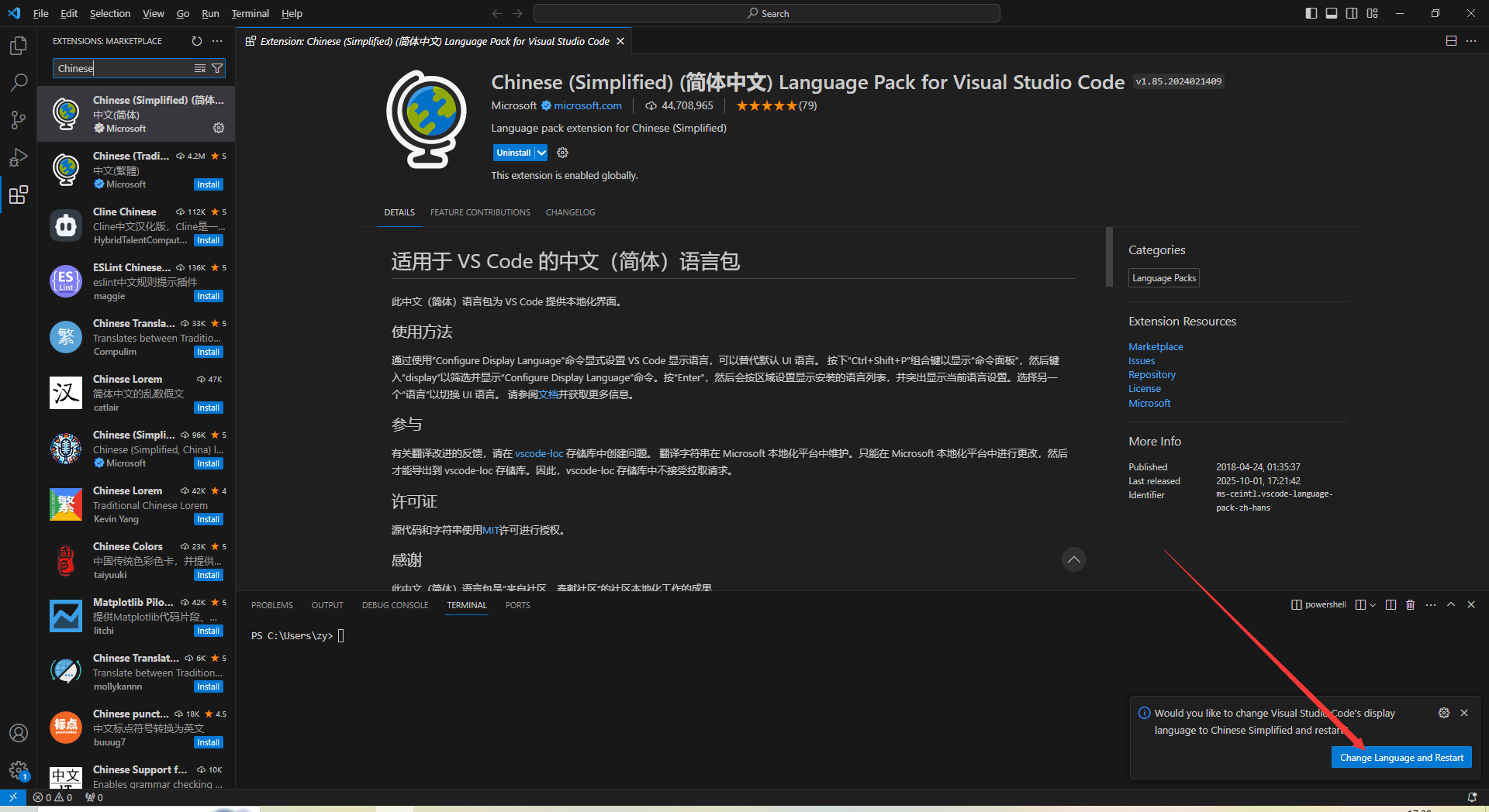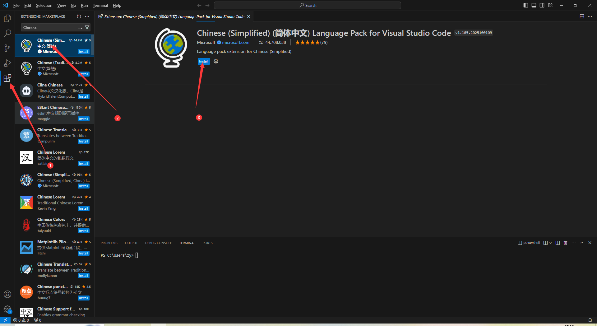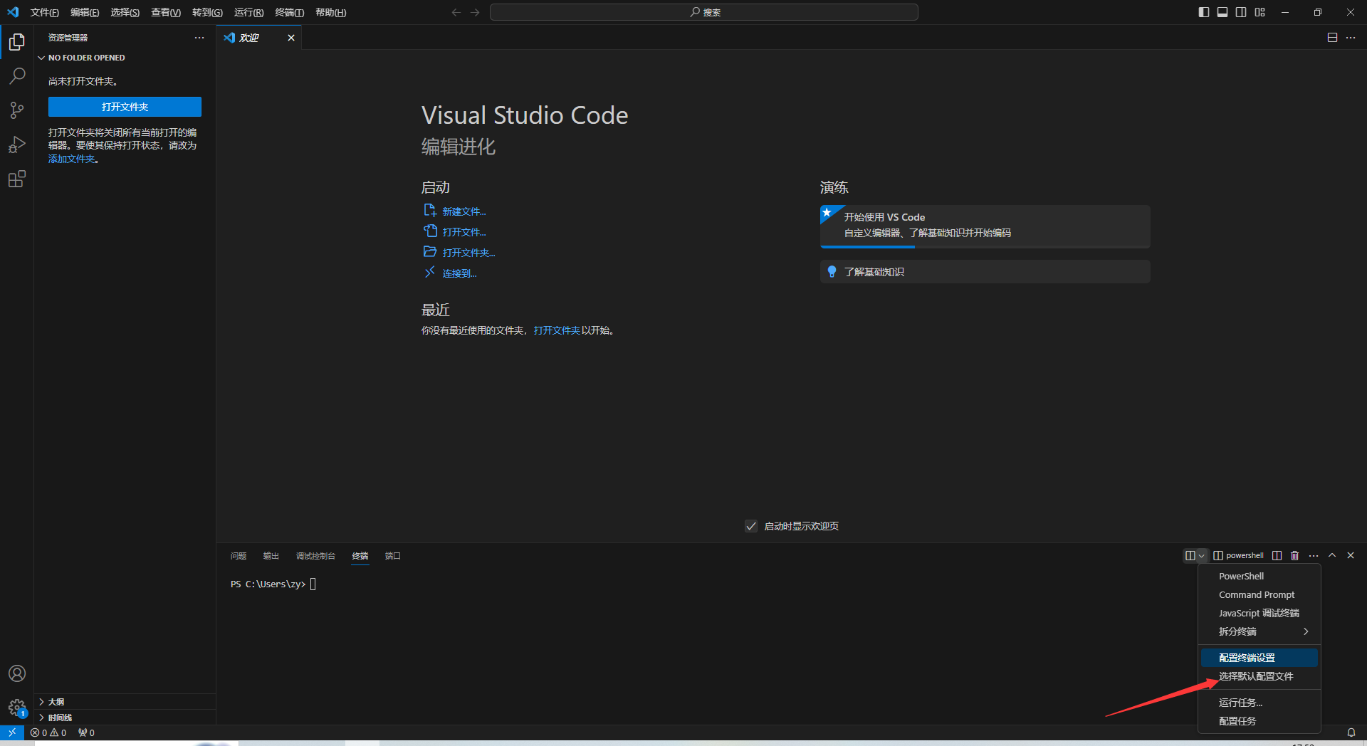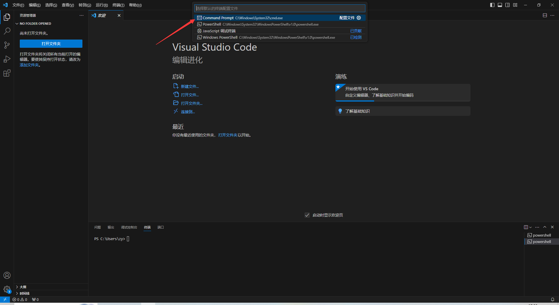 1.下载网址: https://vscode.js.cn/Download 2.安装后汉化: 安装后重启vscode即完成汉化: 3.设置 vscode 的默认终端或命令行 1.点击“选择默认配置文件” 2.选择你想默认打开的终端: