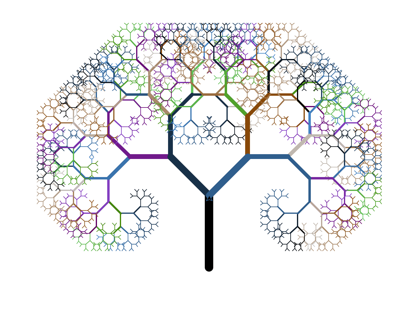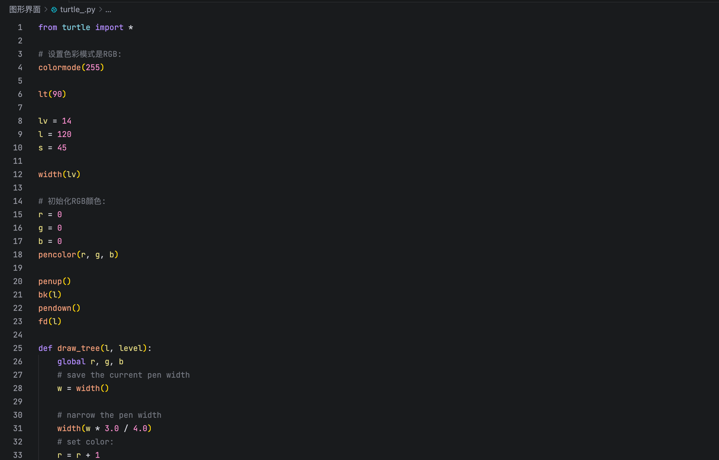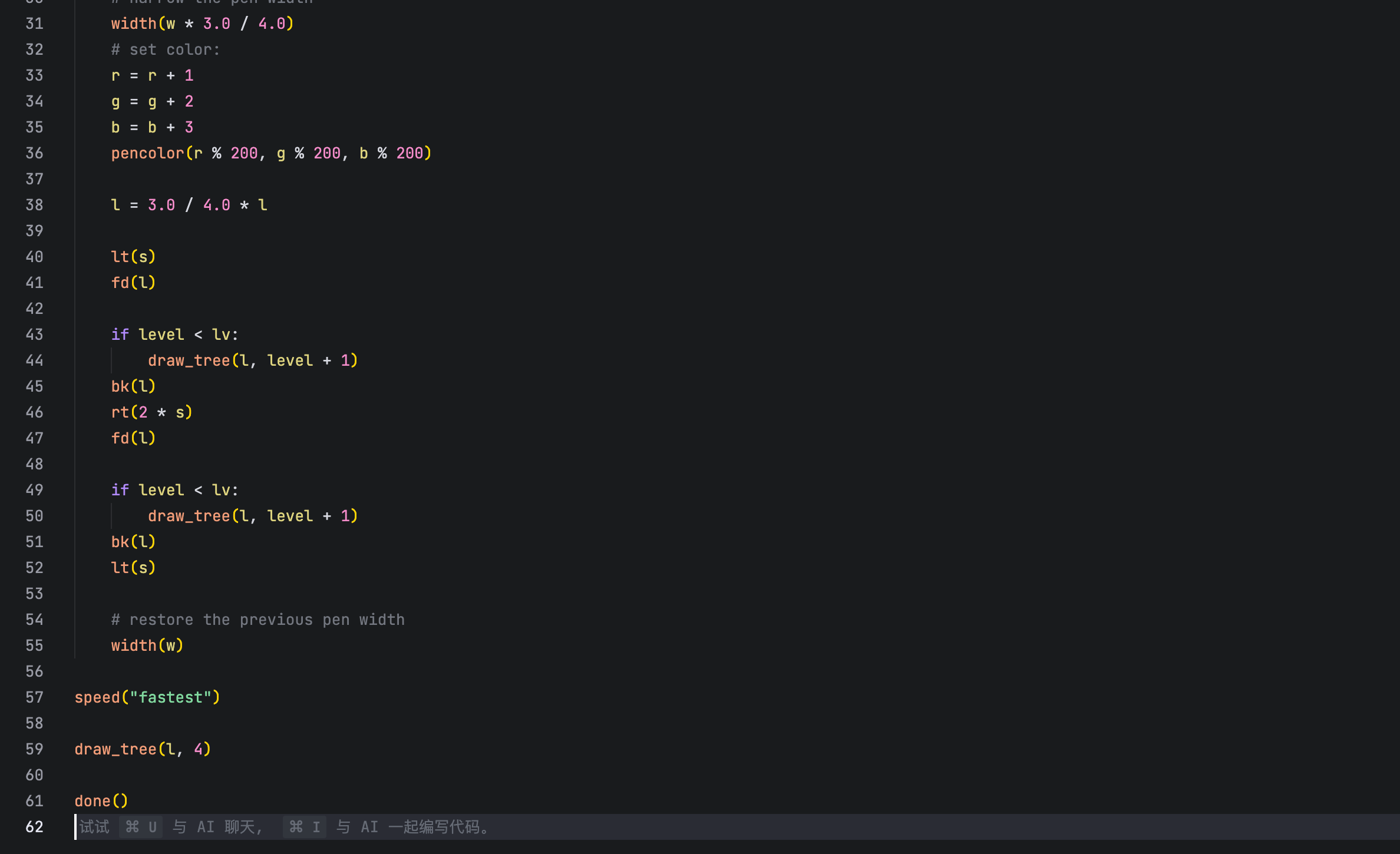 使用递归,可以绘制出非常复杂的图形。例如,下面的代码可以绘制一棵分型树: