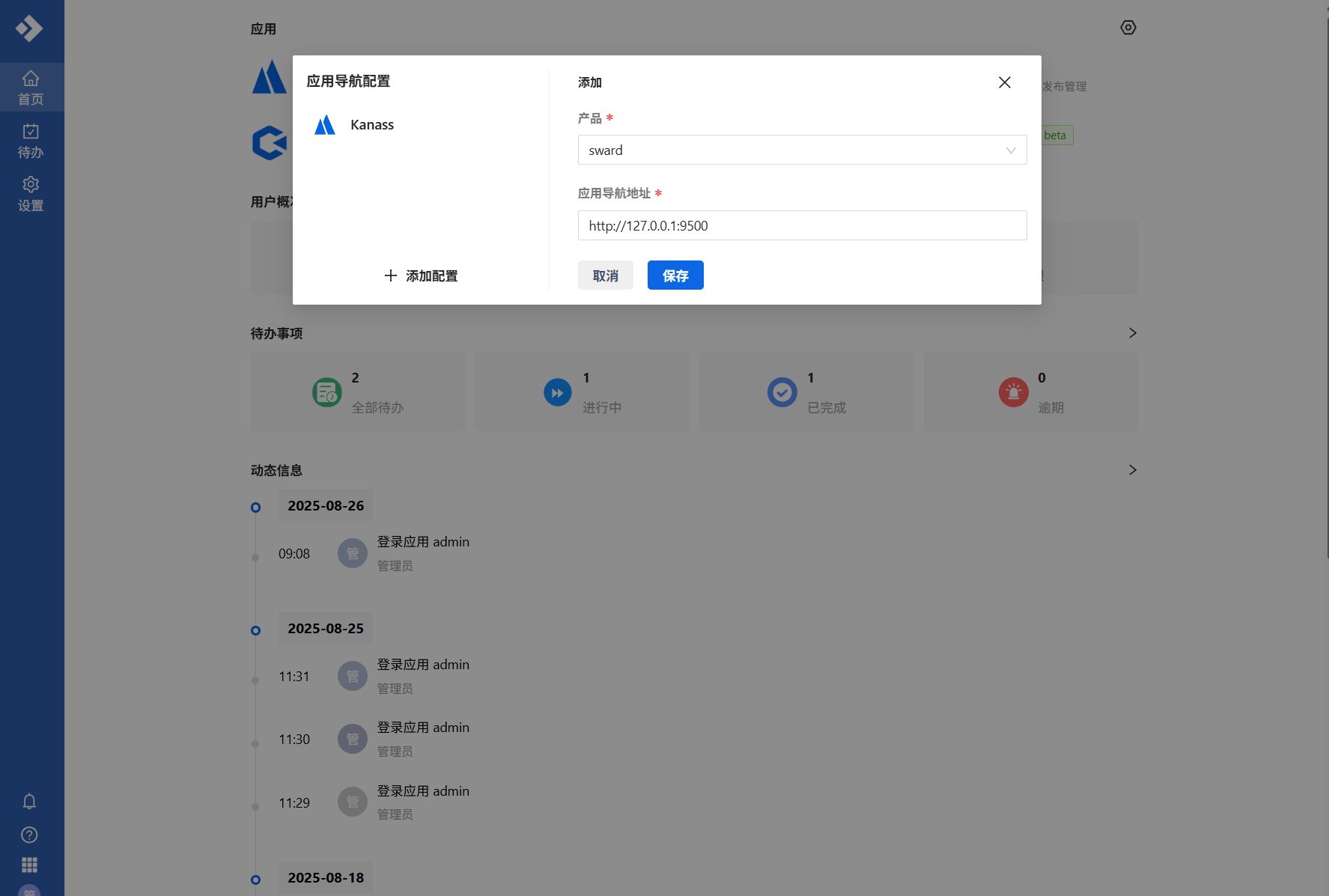 首页->应用配置->选择产品->sward->应用导航地址为sward链接地址->保存