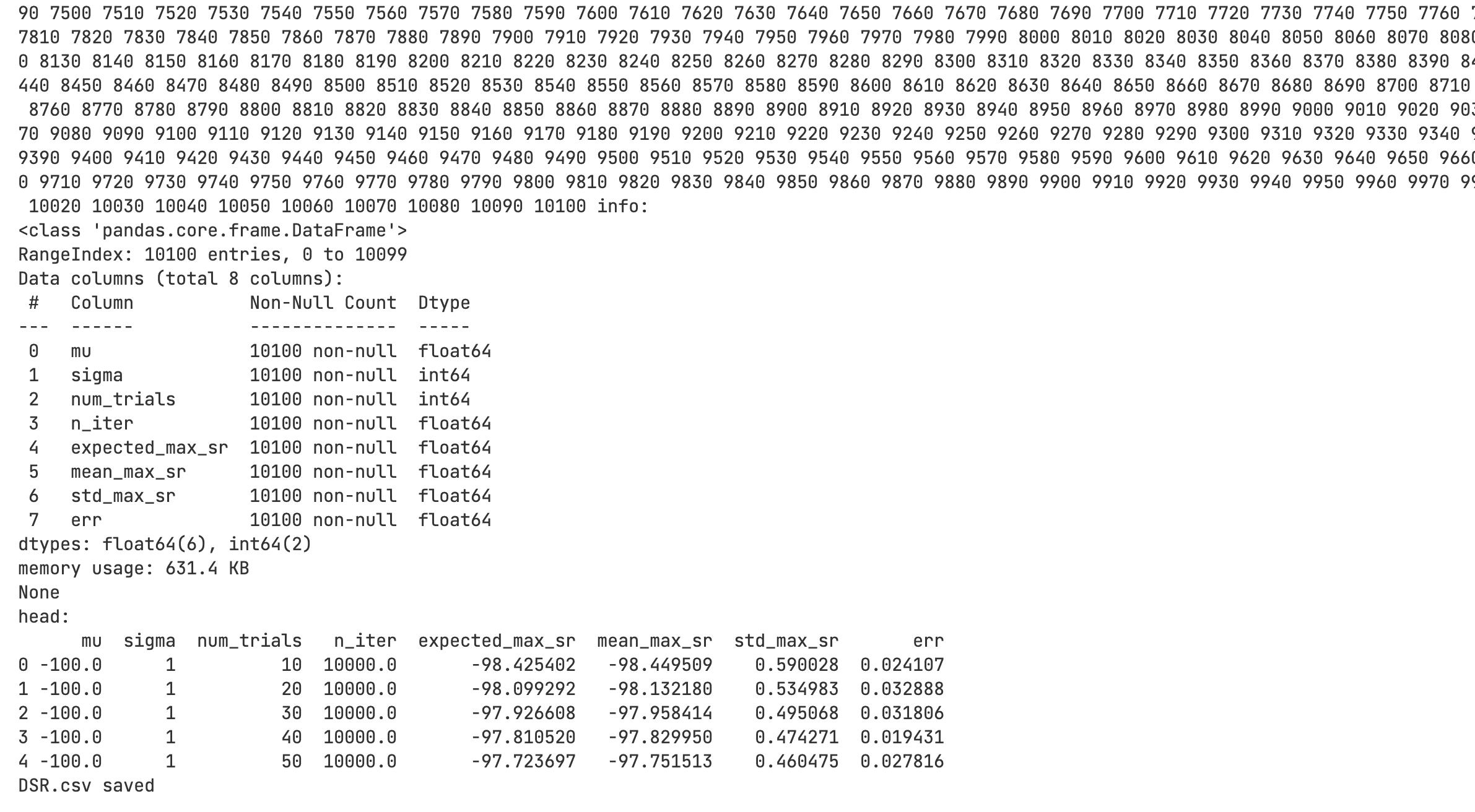 def simulate(mu, sigma, num_trials, n_iter):"""Get analytical and numerical solutions"""expected_max_sr = get_analytical_max_sr(mu, sigma, num_trials)mean_max_sr, stdmean_max_sr = get_numerical_max_sr(mu, sigma, num_trials, n_iter)return expected_max_sr, mean_max_sr, stdmean_max_srdef main():n_iter, sigma, output, count = 1e4, 1, [], 0for i, prod_ in enumerate(product(np.linspace(-100, 100, 101), range(10, 1001, 10)), 1):if i % 10 == 0:print(i, end=' ', flush=True)mu, num_trials = prod_[0], prod_[1]expected_max_sr, mean_max_sr, std_max_sr = simulate(mu, sigma, num_trials, n_iter)err = expected_max_sr - mean_max_sroutput.append([mu, sigma, num_trials, n_iter,expected_max_sr, mean_max_sr,std_max_sr, err])output = pd.DataFrame(output,columns=['mu', 'sigma', 'num_trials', 'n_iter','expected_max_sr', 'mean_max_sr','std_max_sr', 'err'])