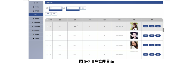 管理员点击用户管理:在用户管理页面,可以对账号、姓名、年龄、性别、手机、头像等信息,进行查询或者添加、删除用户信息等操作,如图5-9所示: