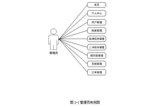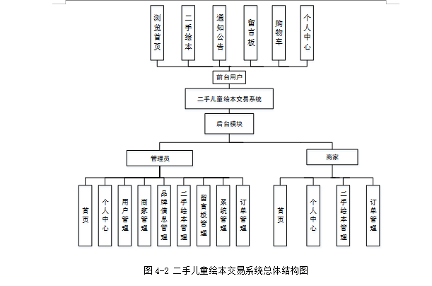 管理员模块属于是网站的后台,进入之后有大量的管理员功能,为了维护网站的稳定与页面的布局,将管理员模块的功能详细化后可以使用系统管理对页面进行布局修改,可以发布公告提示用户规范,用户模块只可以对二手绘本、通知公告等进行查询等,并且更改个人信息,二手儿童绘本交易系统总体结构图如图4-2所示。