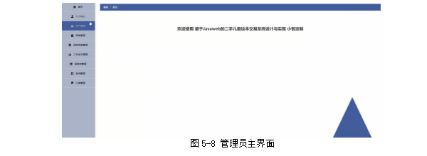 管理员进入系统主页面,主要功能包括对首页、个人中心、用户管理、商家管理、品牌信息管理、二手绘本管理、留言板管理、系统管理、订单管理等进行操作。管理员主页面如图5-8所示:
