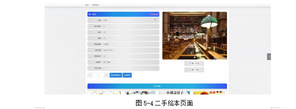 用户点击二手绘本页面的搜索栏输入绘本名称、品牌、新旧程度,进行查询,然后可以查看绘本名称、品牌、图片、新旧程度、上架日期、商家账号、店铺名、单限、库存、价格等信息,如果有需要可以添加到购物车、立即购买、收藏或者评论等操作,如图5-4所示: