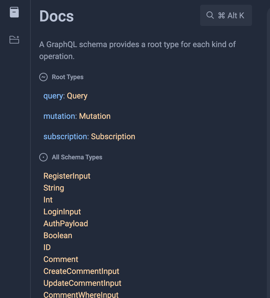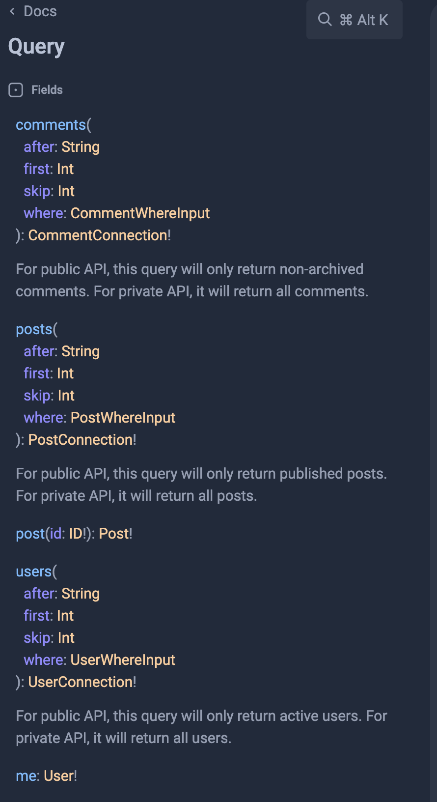 GraphQL 生成的文档如下,类型都非常好的 typed 了,在 playground 中调用也非常的简单,不需要借助第三方工具: