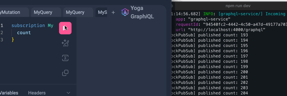Yoga 对 PubSub 的实现也是内置集成的,比起来 Apollo 还需要下载 graphql-subscriptions