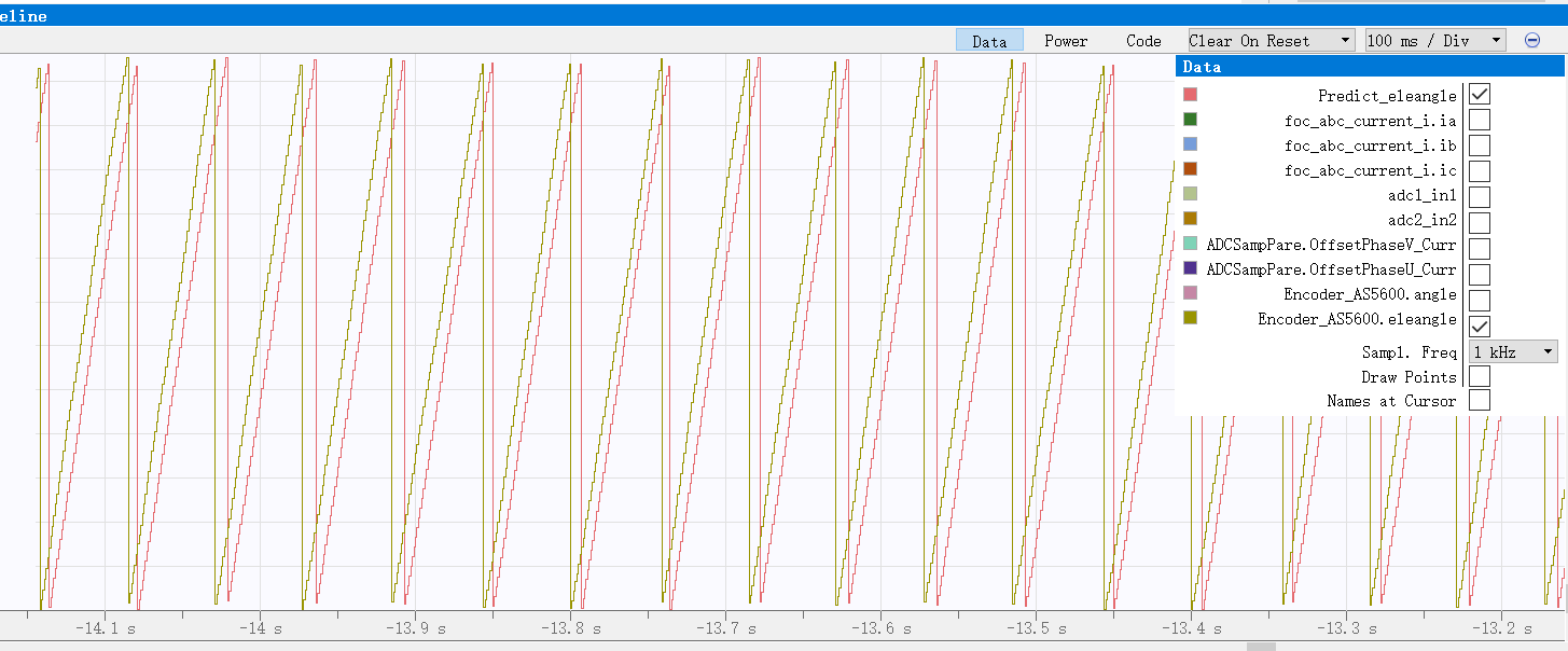我们上电先强拖电机到电角度零点,获取电角度偏移量(AS5600也支持写入电角度零点,这里不做具体介绍),然后在main或者自己的foc中断中调用bsp_as5600GetAngle(&Encoder_AS5600.angle);或者bsp_as5600_DMAGetAngle(&Encoder_AS5600.angle);获取AS5600编码器角度即可