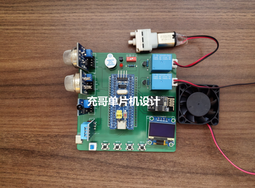 - 自动模式:当检测到火焰,打开水泵灭火并声光报警;检测到温湿度、烟雾浓度、液化气浓度超过阈值打开风扇通风并蜂鸣器报警。