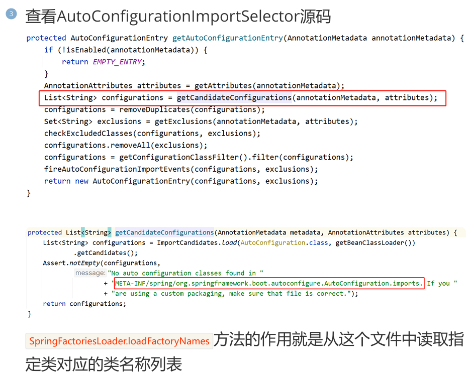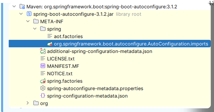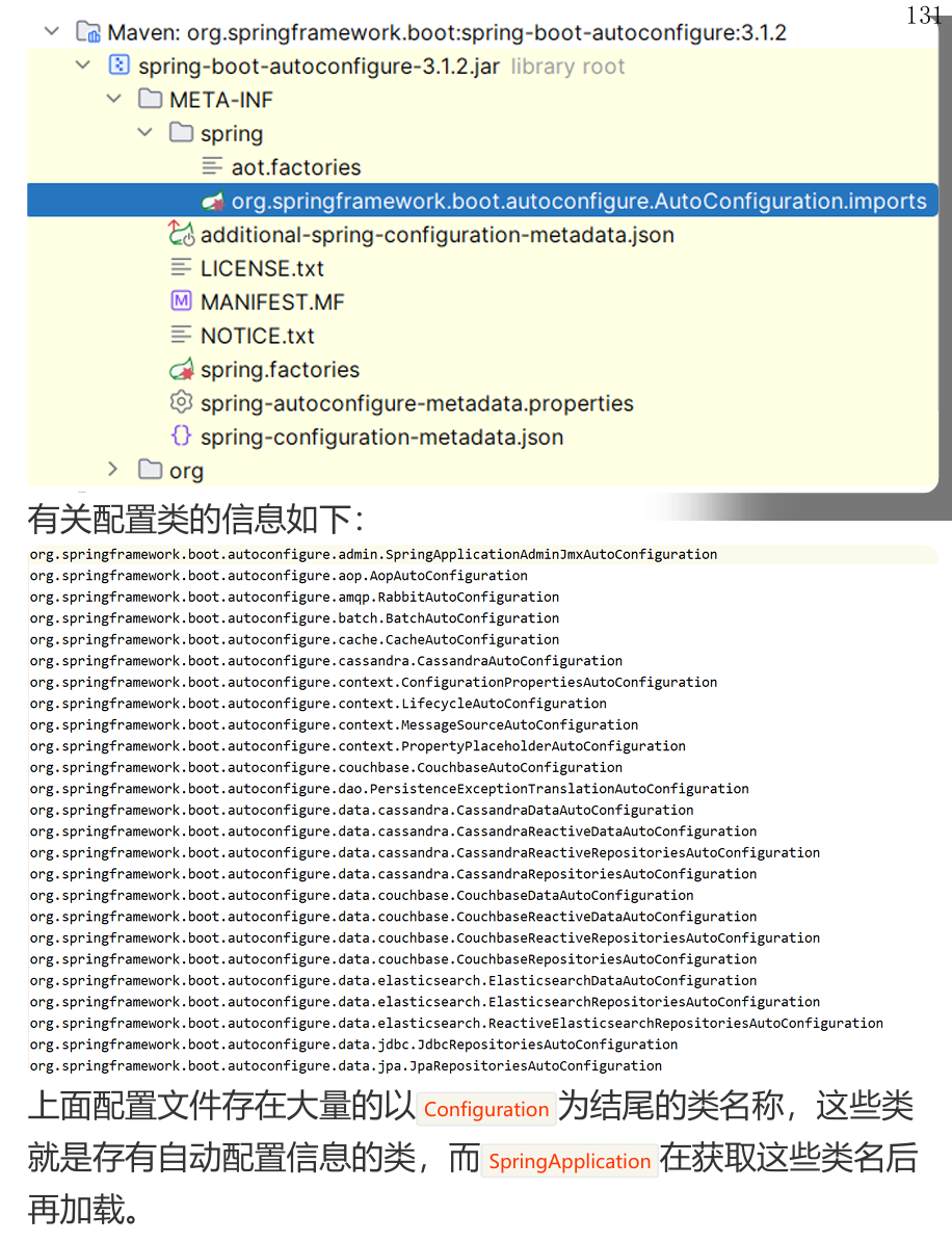 该注解会导入 AutoConfifigurationImportSelector 类对象,该对象会从 META-INF/spring/org.springframework.boot.autoconfigure.AutoConfiguration.imports 文件中读取配置类的名称列表。