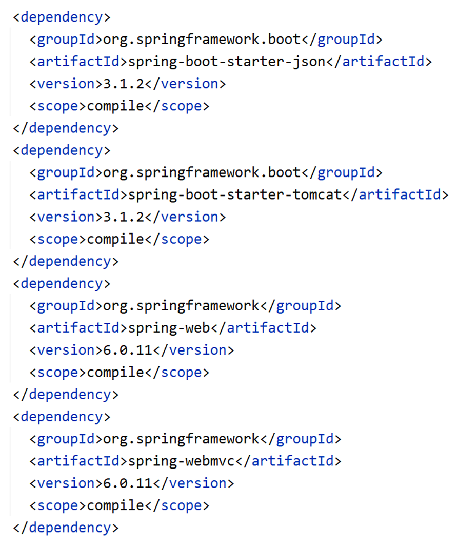 <dependencies><dependency><groupId>org.springframework.boot</groupId><artifactId>spring-boot-starter-web</artifactId></dependency><dependency><groupId>org.springframework.boot</groupId><artifactId>spring-boot-starter-test</artifactId><scope>test</scope></dependency></dependencies>