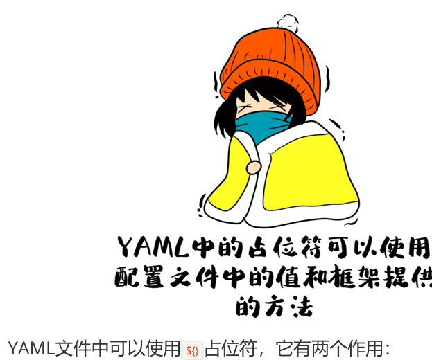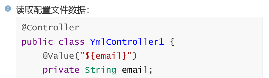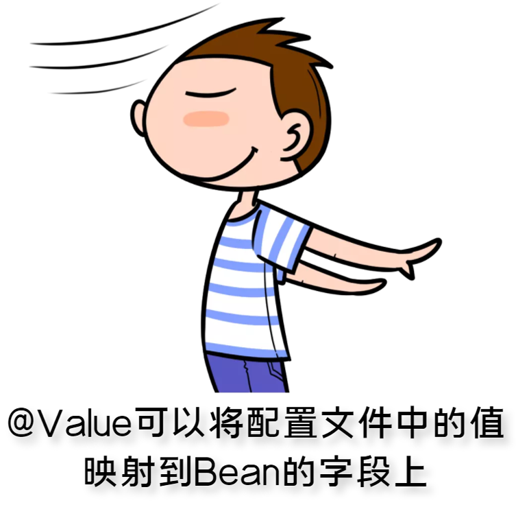 读取自定义配置时,我们可以通过@Value注解将配置文件中的值映射到一个Spring管理的Bean的字段上,用法如下: