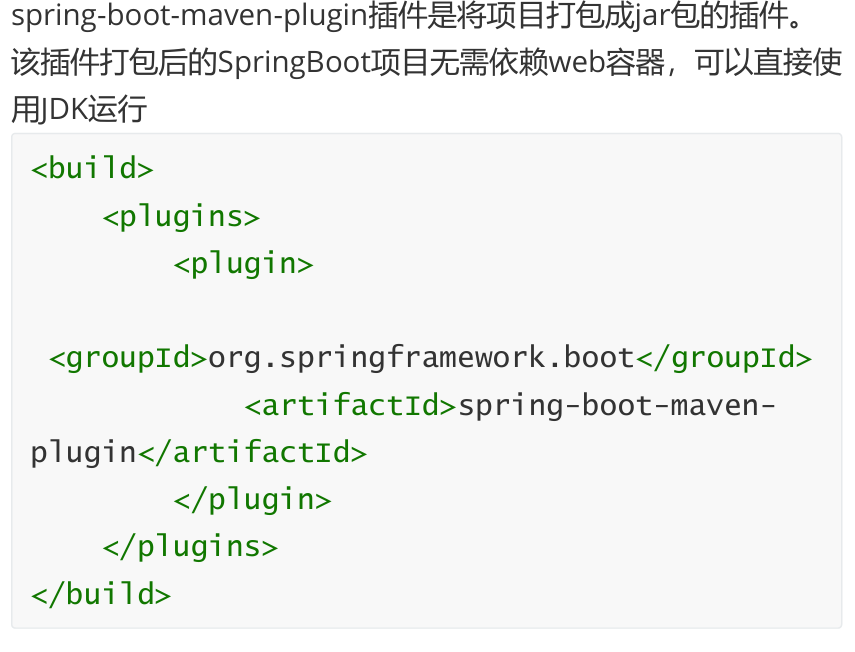 SpringBoot项目是依赖于Maven构建的,但打包时如果只依赖 Maven打包工具则会打包不完整,我们还需要在SpringBoot项目中引入SpringBoot打包插件 :