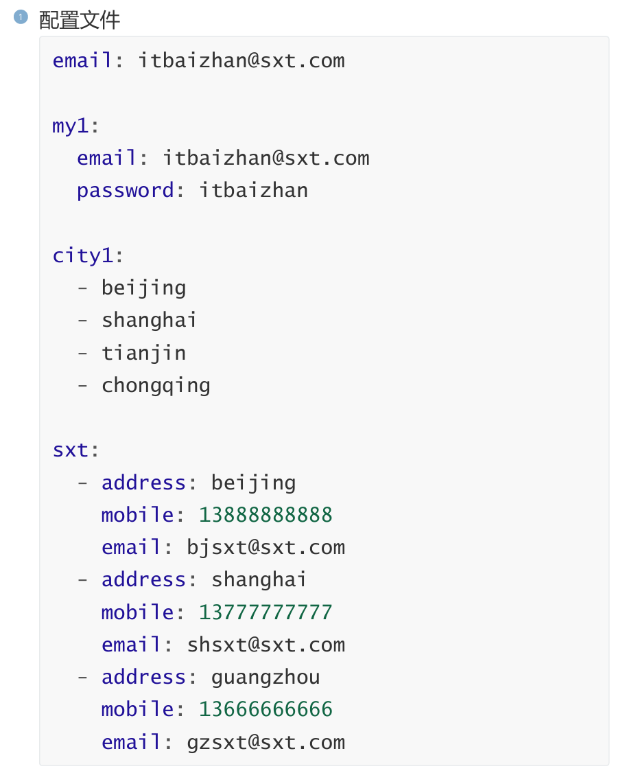 # 邮箱1my1:email: itbaizhan@sxt.compassword: itbaizhan# 邮箱2my2: {email: itbaizhan1@sxt.com,password: