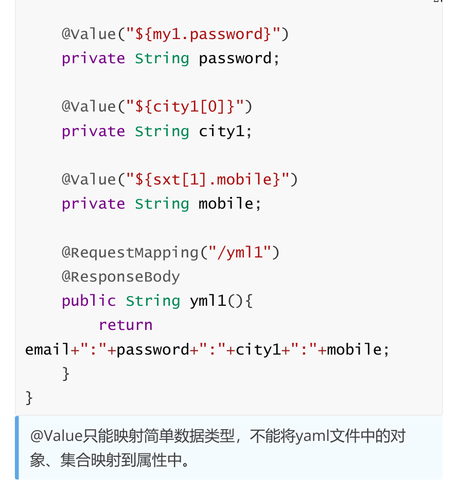 @Controllerpublic class YmlController3 {@Value("${myconfig.myport}")private int port;@RequestMapping("/yml3")@ResponseBodypublic String yml3(){System.out.println(port);return "hello springboot!";}