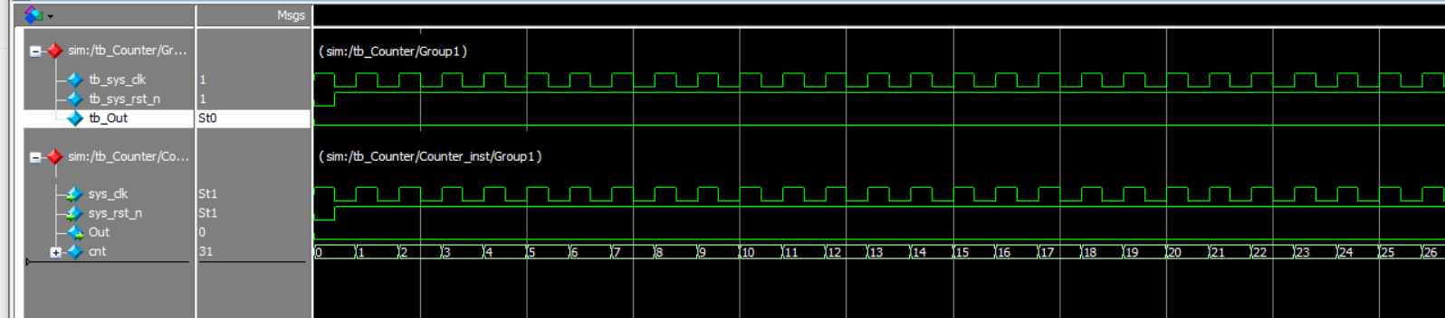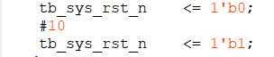 reg tb_sys_rst_n ;wire tb_Out ;initial begintb_sys_clk <= 1'b1;tb_sys_rst_n <= 1'b0;#10tb_sys_rst_n <= 1'b1;endalways #10 tb_sys_clk <= ~tb_sys_clk;Counter #(.cnt_max(25'd24999999))Counter_inst(.sys_clk (tb_sys_clk ),.sys_rst_n (tb_sys_rst_n),.Out (tb_Out ) );endmodule