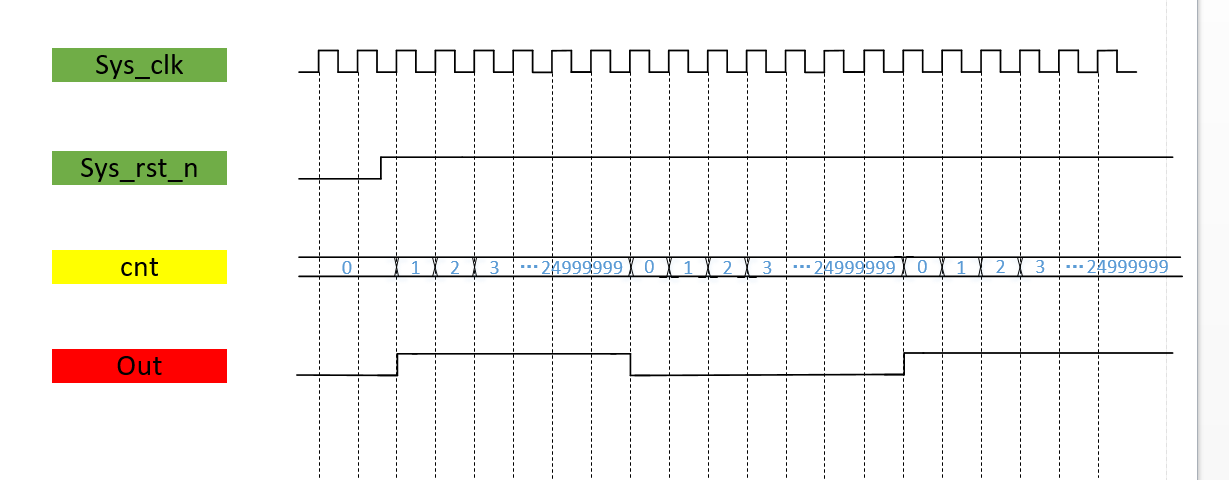 );reg [24:0] cnt;always@(posedge sys_clk or negedge sys_rst_n)if(sys_rst_n == 1'b0)cnt <= 25'b0;else if(cnt == cnt_max)cnt <= 25'b0; elsecnt <= cnt + 25'b1;always@(posedge sys_clk or negedge sys_rst_n)if(sys_rst_n == 1'b0)Out <= 1'b0;else if(cnt == cnt_max)Out <= ~Out;endmodule