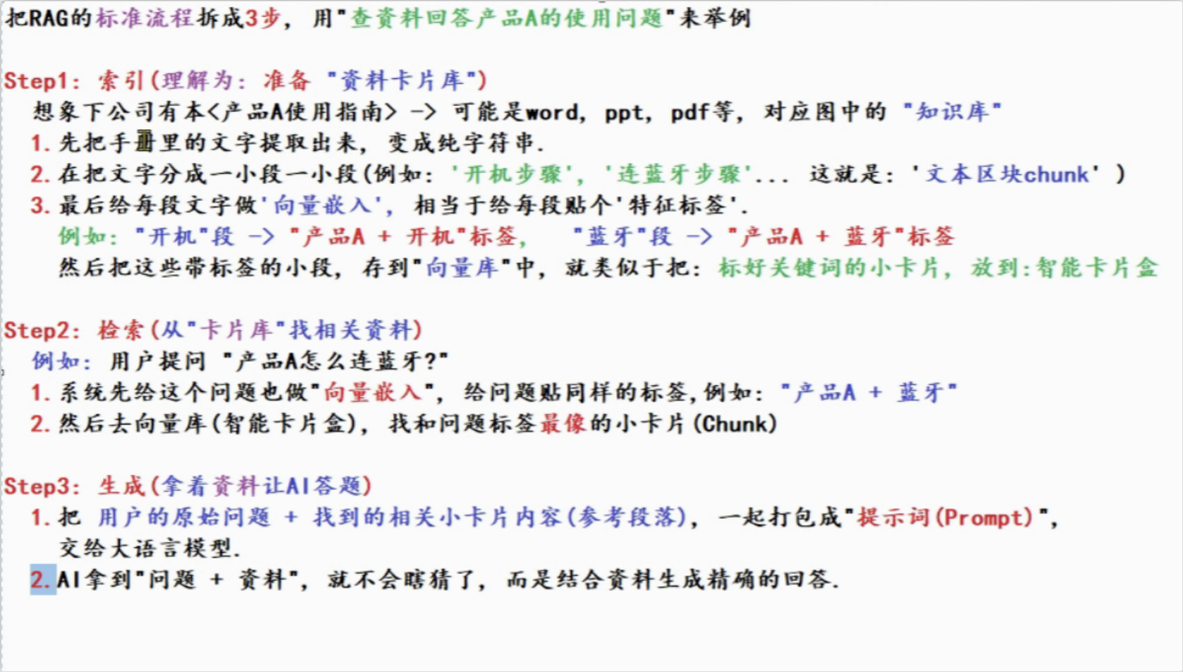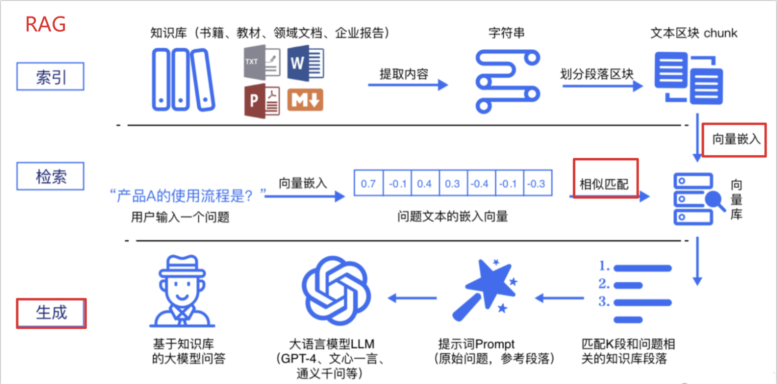 检索阶段,用户输入的查询(query)被转化为向量表示,通过相似度匹配从向量数据库中检索出最相关的文本块。